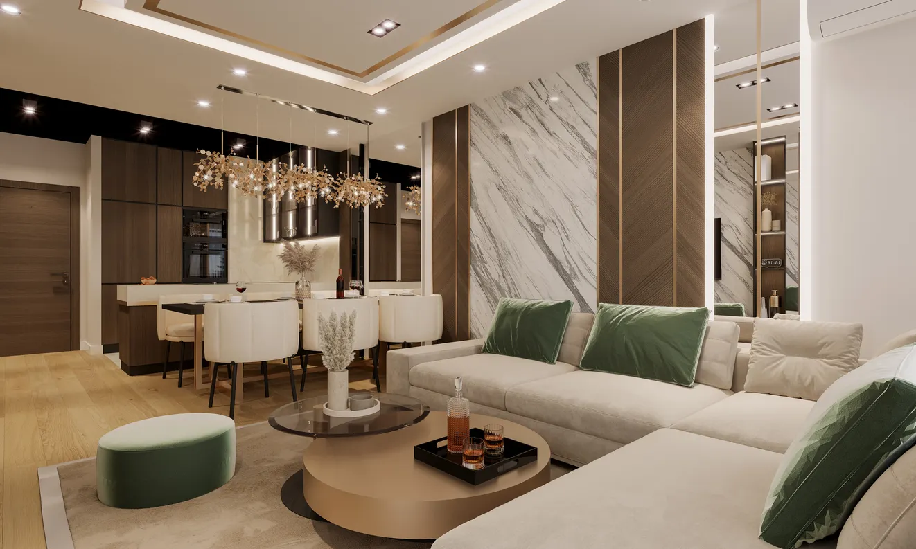 Ważne jest zachowanie w tym całym przepychu równowagi, nie zapominając, że wnętrza mają wyglądać jak te z apartamentów i willi najsłynniejszych gwiazd Hollywood. Styl cechujący się bogactwem obejmuje eleganckie i szlachetne materiały wykonania. W szczególności marmur wykorzystywany, jako blat kuchenny lub jadalniany. Często spotykane jest też drewno lite. Meble wykonane z naturalnego drewna, traktowane są jako symbol elegancji i wyjątkowej klasy.