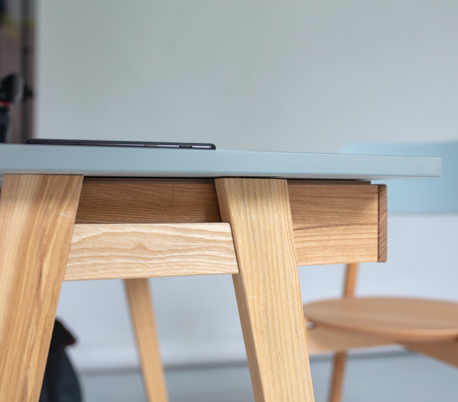 Narożne biurko do pracy i nauki to połączenie naturalnych materiałów z odważnym podejściem do designu. Jego blat w kształcie litery L, wykonany z laminowanej płyty MDF w kolorze jasnoszarym oferuje dużą, wygodną powierzchnię roboczą pozwalającą na komfortową pracę i organizację przestrzeni. Stabilne nogi z drewna jesionowego w naturalnym odcieniu nadają meblowi trwałości oraz ciepłego charakteru, a dbałość o detale widoczna jest w wyposażeniu mebla w szufladę z cichym domykiem. Dzięki niej drewniane biurko prawostronne jest nie tylko piękne, ale i praktyczne.