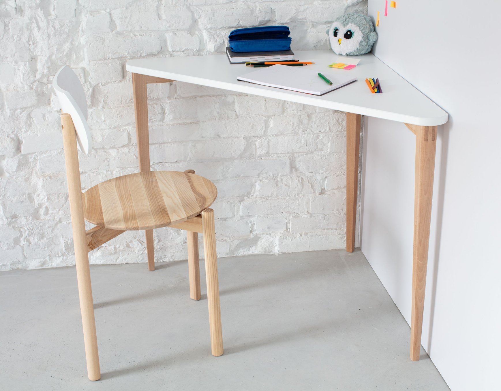 Biurko narożne do nauki i pracy utrzymane jest w skandynawskiej estetyce, która odpowiada za jego naturalny wygląd i wizualną lekkość. Cechuje je prosty, minimalistyczny design oraz trójkątny blat w ciemnoniebieskim kolorze. Blat wykonany jest z wytrzymałej płyty laminowanej, natomiast nogi z solidnego drewna bukowego. Biurko posiada certyfikat FSC®, co oznacza, że drewno zostało pozyskane z lasów zarządzanych w sposób zrównoważony.