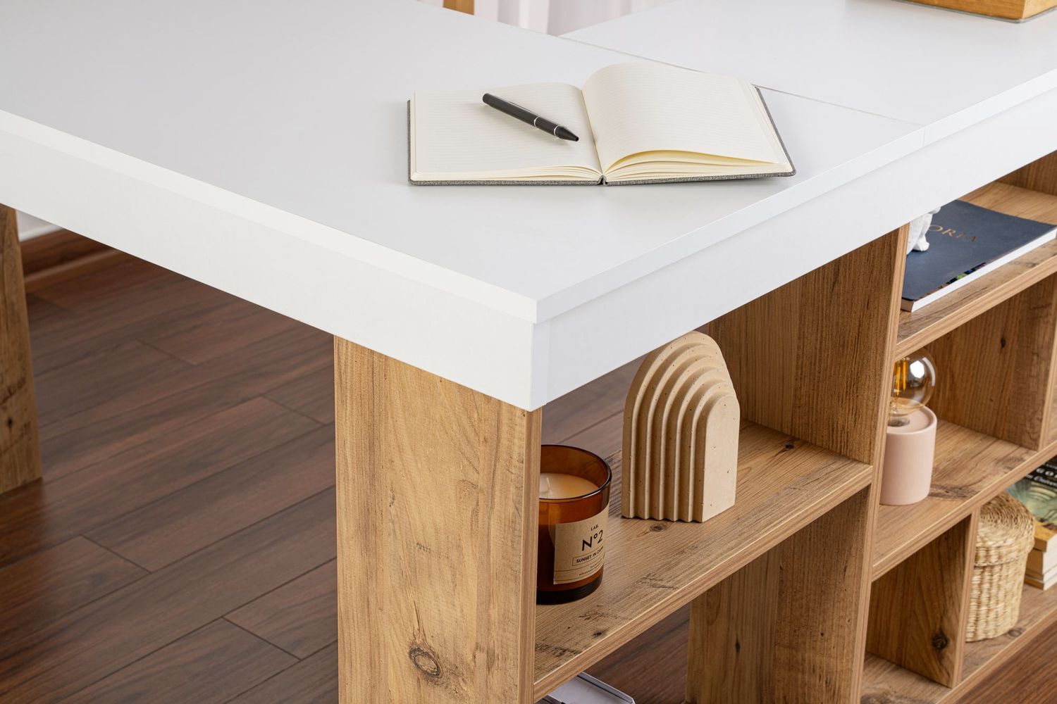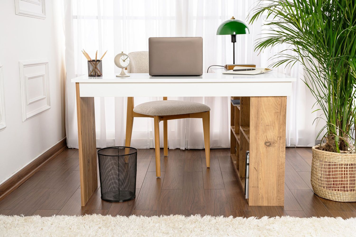 Biurko narożne z regałem VESPER 120x130 to idealne rozwiązanie dla osób, które cenią sobie funkcjonalność oraz nowoczesny design. To eleganckie biurko doskonale wpisuje się w estetykę współczesnych wnętrz, a jego przemyślana konstrukcja sprawia, że znajduje zastosowanie zarówno w domowym biurze, jak i pokoju dziecięcym lub młodzieżowym. Jednym z wyróżniających elementów tego biurka jest jego kształt narożny, który umożliwia optymalne zagospodarowanie przestrzeni w pomieszczeniach o ograniczonej powierzchni. Zapewnia wystarczająco dużo miejsca na laptopa, dokumenty oraz inne niezbędne akcesoria biurowe. Dzięki zastosowaniu wysokiej jakości płyty laminowanej, powierzchnia blatu jest nie tylko estetyczna, ale również odporna na zarysowania oraz łatwa w utrzymaniu w czystości. Nogi biurka wykonane w naturalnym kolorze wprowadzają do wnętrza ciepło i przytulność. Taki kontrast sprawia, że biurko jest nie tylko praktyczne, ale również atrakcyjne wizualnie, stanowiąc doskonałą bazę dla wszystkich dodatków biurowych oraz osobistych akcentów.