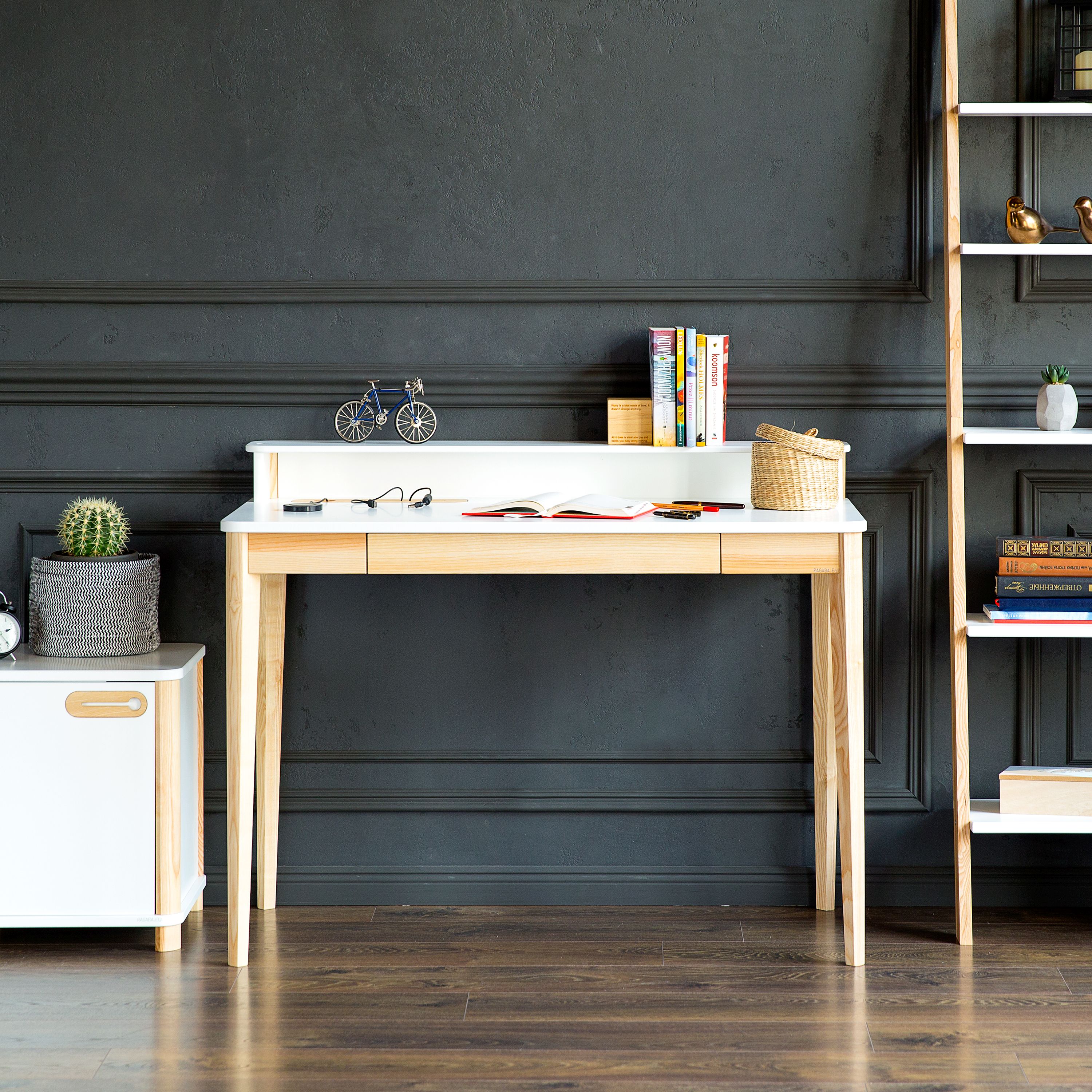 Dużebiurko z nadstawką na monitor wyróżnia się minimalistycznym, skandynawskim kształtem o lekkiej i prostej formie. Jego blat ma zaokrąglone krawędzie, a wymiary blatu 110x56 zapewniają wygodną przestrzeń do pracy i nauki. Mebel wykonany jest z naturalnego drewna jesionowego i laminowanej płyty MDF – trwałych i odpornych na codziennie użytkowanie. Dodatkowo minimalistyczne biurkoniebieskie wyposażono w praktyczną szufladę oraz otwory w blacie, które pomagają w estetyczny sposób zorganizować okablowanie.