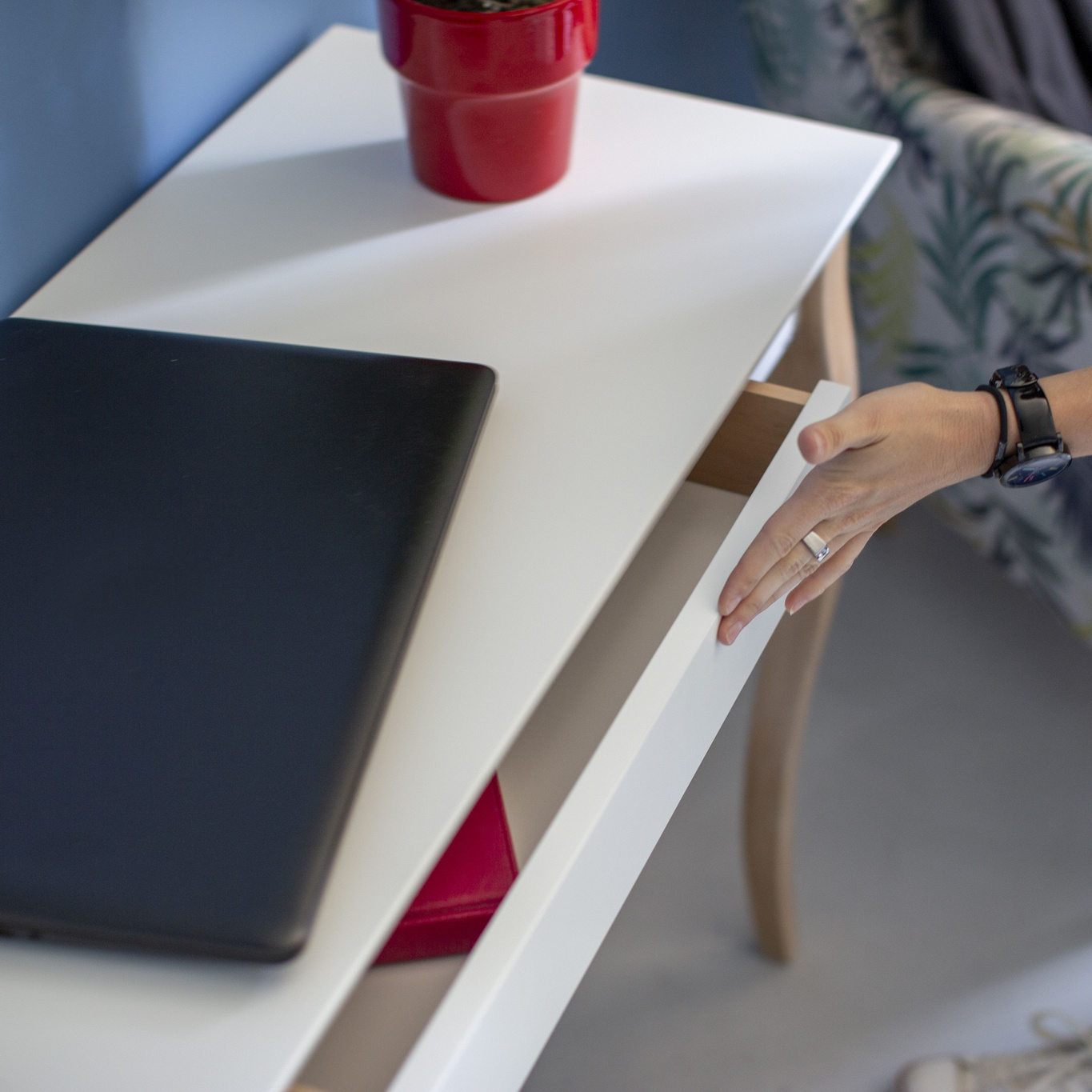 To małe dwukolorowe biurko doskonałe rozwiązanie dla każdego, kto ceni funkcjonalność i styl w swojej przestrzeni. Idealnie sprawdzi się zarówno w pokoju dziecięcym i młodzieżowym, jak i w domowym biurze czy pracowni, oferując wygodną powierzchnię do nauki, pracy czy kreatywnych działań. Jego kompaktowe rozmiary pozwalają na swobodne dopasowanie do różnych wnętrz, a praktyczna szuflada ułatwia utrzymanie porządku, zapewniając miejsce na niezbędne akcesoria.