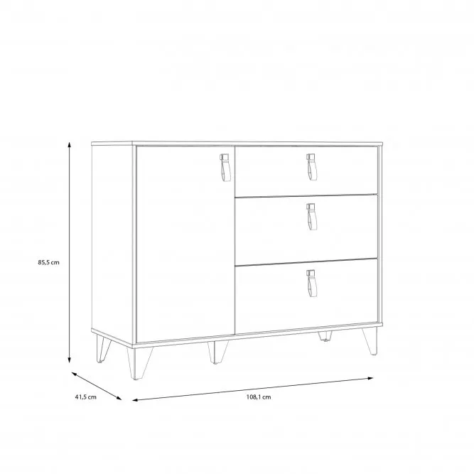 Komoda LYA to praktyczny organizer na ubrania, zabawki, dokumenty. Wnętrze mebla podzielono na szafkę oraz 3 pojemne szuflady. Tym, co wyróżnia kolekcję są ciekawe uchwyty w formie pętelek z tworzywa.
