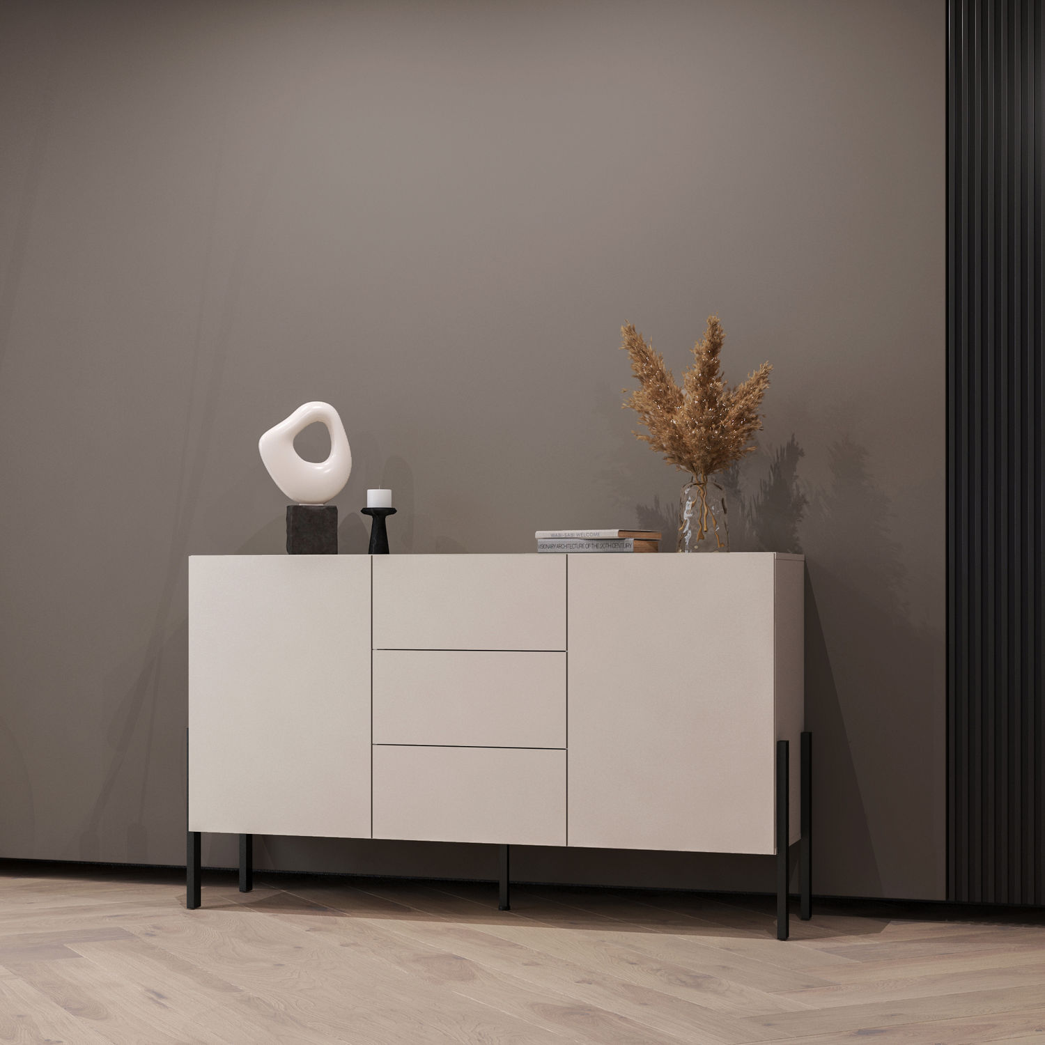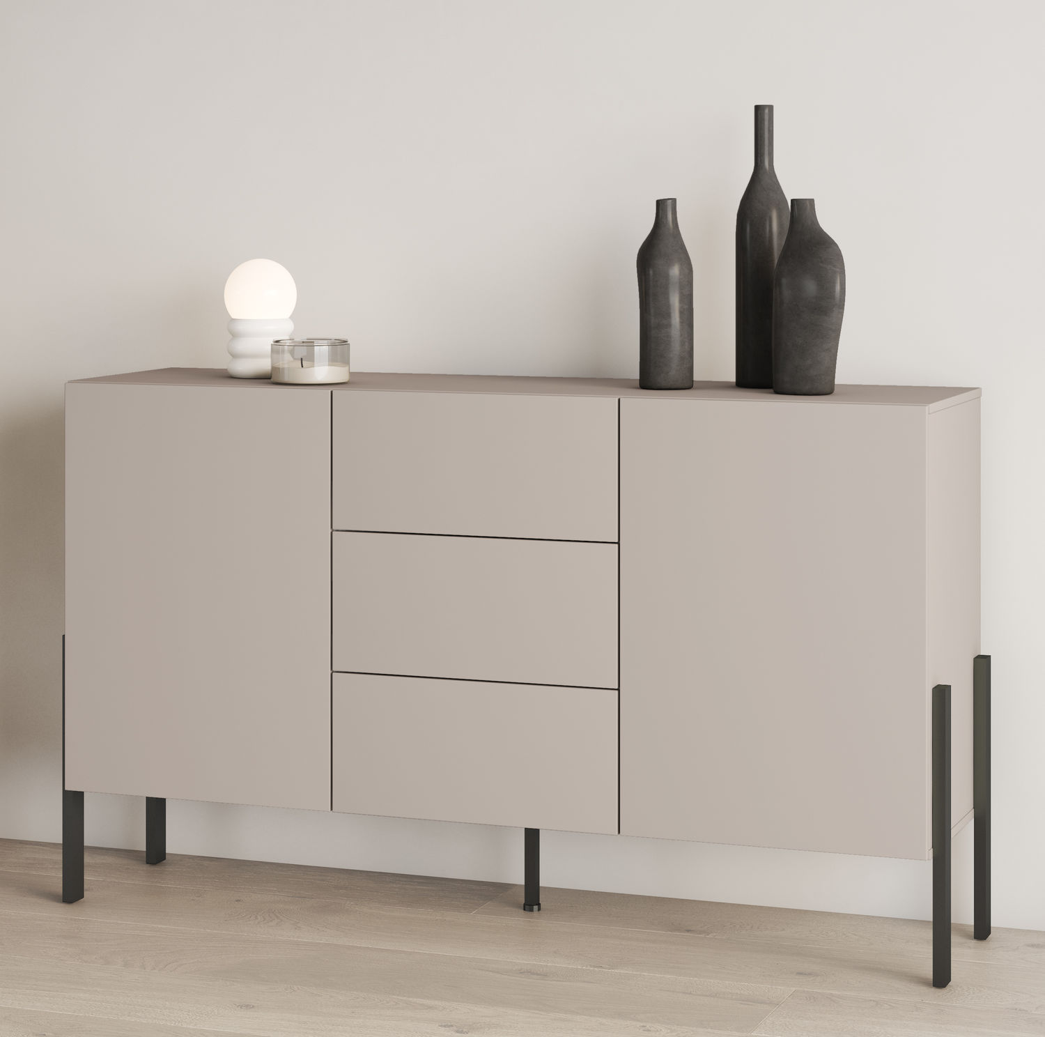 Duża komoda 2-drzwiowa została wykonana jest z wysokiej jakości płyty laminowanej, w eleganckim kaszmirowym odcieniu, co tworzy efektowny kontrast z czarnymi metalowymi nóżkami. Solidna konstrukcja zapewnia trwałość, a liczne pojemne przegrody – dwie szafki i trzy szuflady – umożliwiają schludne przechowywanie zarówno dużych, jak i mniejszych przedmiotów. Aby zachować minimalistyczną formę, komodę na nóżkach 154 cm wyposażono w system otwierania push to open, który nie wymaga uchwytów.