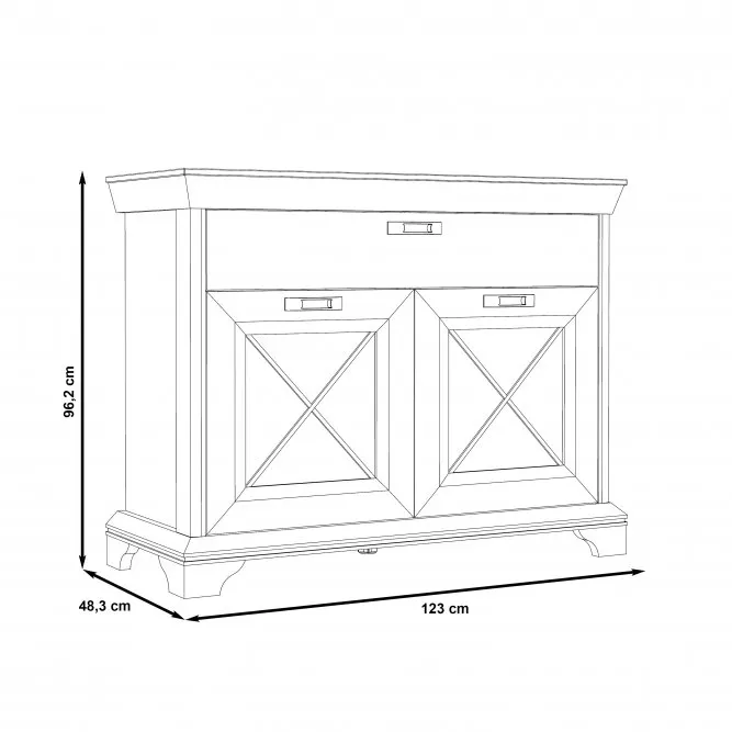 Komoda z kolekcji KASHMIR idealnie wpisuje się w aranżację salonu w stylu prowansalskim. Ciepły kolor pinii białej, charakterystyczne fronty, metalowe uchwyty w kolorze starego srebra, stylizowane cokoły i nóżki oraz szprosy to cechy wyróżniające kolekcję. Pojemna szafka oraz szuflada pozwolą w funkcjonalny sposób zorganizować akcesoria domowe. Mebel w połączeniu z pozostałymi bryłami kolekcji idealnie sprawdzi się w pokoju dziennym jak i salonie, czy jadalni.