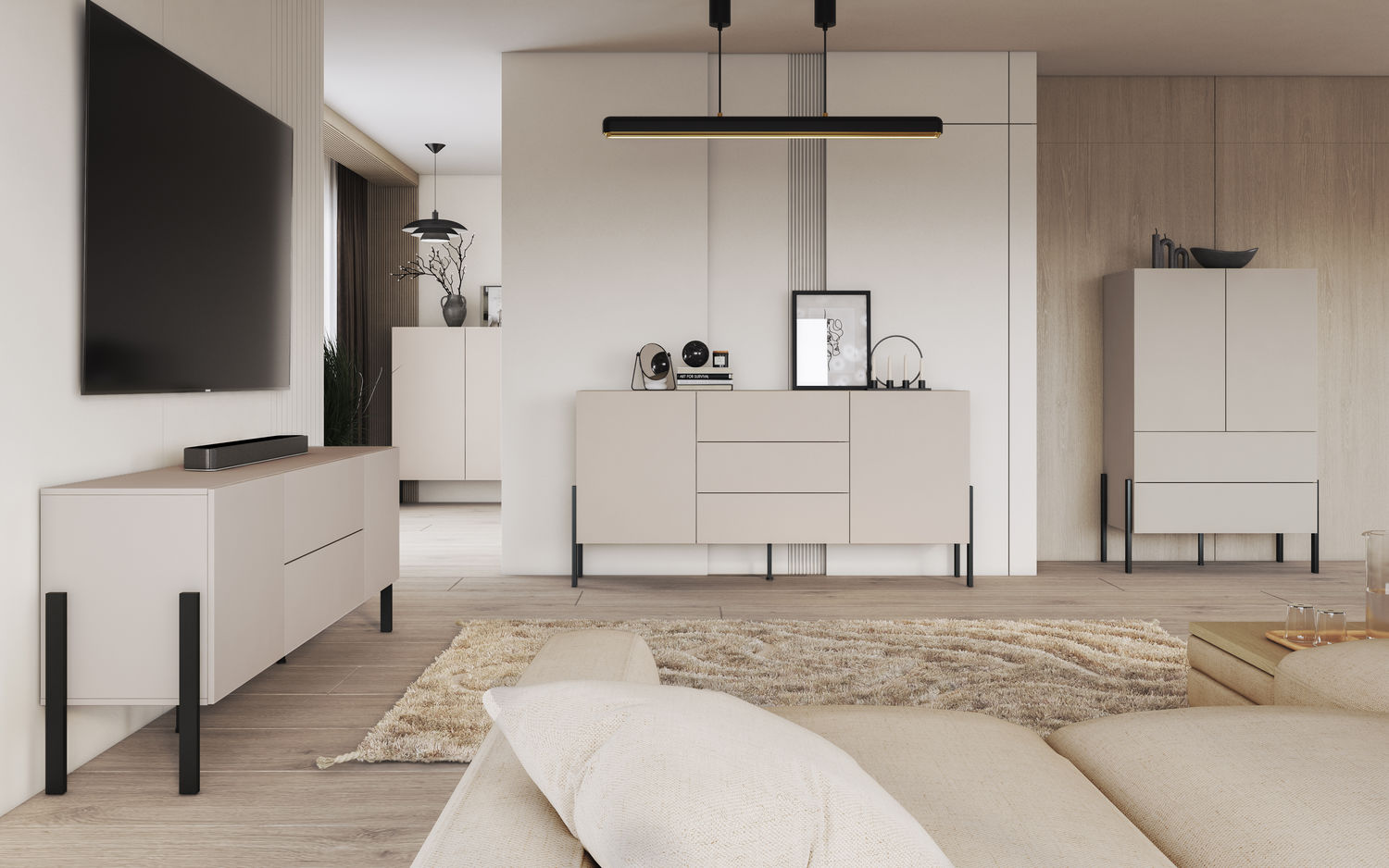 Kaszmirowa szafka pod telewizor to mebel, który z powodzeniem łączy funkcjonalność z nowoczesną stylistyką, świetnie wpisując się w minimalistyczne i industrialne wnętrza. Dzięki matowemu wykończeniu i stonowanej kolorystyce, wprowadza do przestrzeni subtelność i spokój, stanowiąc eleganckie tło dla sprzętu RTV oraz dekoracji. Ta duża szafka RTV 204 cm to uniwersalne rozwiązanie, które sprawdzi się zarówno w salonie, jak i pokoju dziennym czy przestrzeni biurowej, łącząc praktyczność z wyrafinowanym designem.