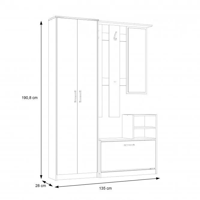 Kompleksowy zestaw funkcjonalnych mebli do nowoczesnego przedpokoju. Wykonany jest w dekorze Dąb Sonoma, dzięki czemu można go idealnie skomponować z innymi meblami z tej samej kolekcji.