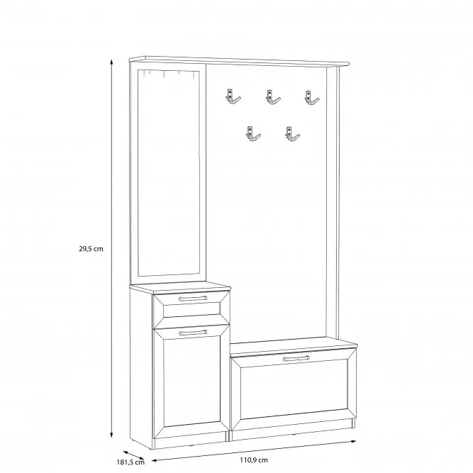 Kompleksowy i praktyczny zestaw mebli do przedpokoju. Wykonany w dekorze Dąb Sonoma sprawdzi się zarówno w nowoczesnych, jak i klasycznych aranżacjach. Dekor imitujący naturalne drewno nada wnętrzu dużo ciepła, przytulności oraz elegancji.