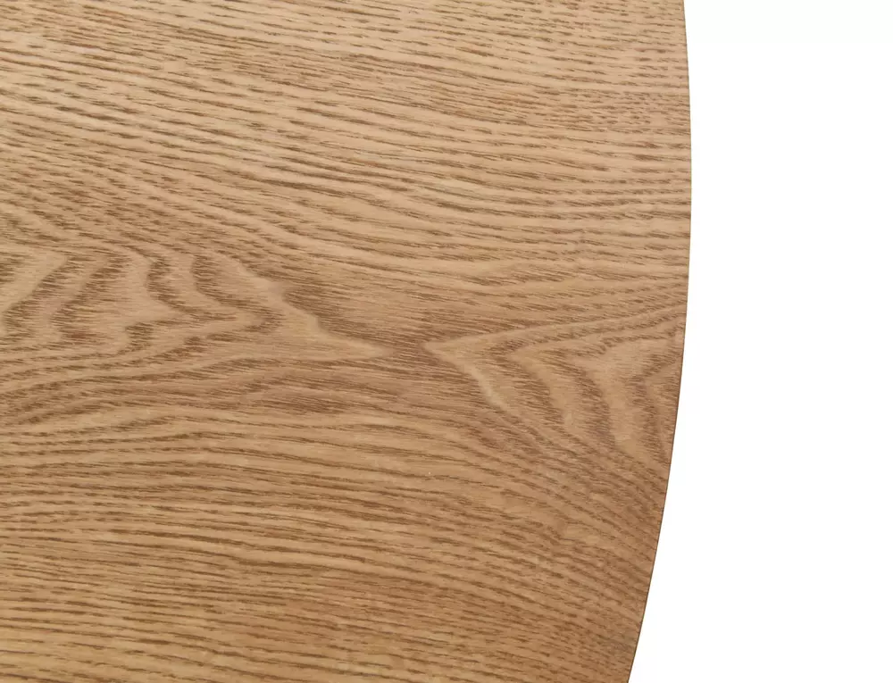 Projekt tego nowoczesnego stołu jest prosty, jednak starannie dopracowany, podobnie jak wybrane materiały. Okrągły blat i stożkowa podstawa zostały wykonane z wysokogatunkowej płyty MDF, wykończonej okleiną w kolorze ciepłego drewna dębowego, z widocznym nieregularnym usłojeniem. Dzięki temu całość jest stabilna, bardzo trwała i lekka, jednak doskonale naśladuje naturalne tworzywo, które wprowadza do wnętrz bezkompromisową przytulność. Dzięki średnicy 100 cm stół pomieści do sześciu osób. Okrągły blat sprzyja otwartości, a brak ostrych krawędzi stanowi bardzo bezpieczne wykończenie, szczególnie dla najmłodszych domowników.