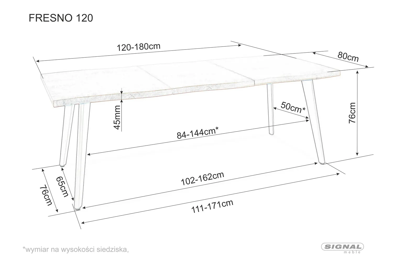 Stół prostokątny Fresno 120(180)x80 cm dąb artisan z metalowymi nogami Signal to stylowa i wytrzymała propozycja do wielu aranżacji wnętrz. Ten wyjątkowy mebel jest częścią kolekcji loft marki Signal i został wykonany z dobrej jakości materiałów, by zapewnić trwałość, dzięki czemu będzie służyć Ci przez długi czas. Blat prostokątnego stołu ma 120 cm długości i 80 cm szerokości, a po rozłożeniu może mieć nawet 180 cm długości. Dzięki specjalnemu systemowi teleskopowemu, rozłożenie stołu jest łatwe i wygodne. Blat stołu wykończony został w kolorze dębu, natomiast nogi są w kolorze czarnym. Zaprojektowany został z myślą o 8 osobach i znajdzie swoje miejsce zarówno w salonie, jak i w jadalni. Stabilne nóżki stołu zapewnią komfort, a dzięki wytrzymałości metalu, będzie to mebel trwały i odporny na zarysowania. Stół posiada dwuletnią gwarancję producenta. Montaż mebla jest prosty i zajmuje około 2 godziny.