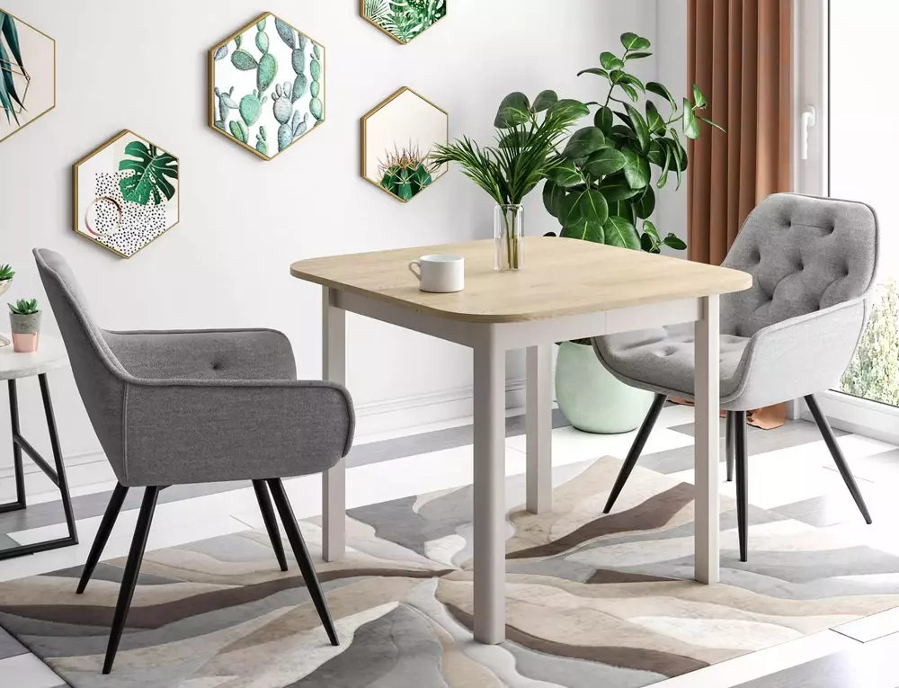 Wyrafinowana estetyka połączona z najwyższą funkcjonalnością to dwa duże wyróżniki tego nowoczesnego rozkładanego stołu. Niewielka bryła o wymiarach 90x90 cm zapewnia optymalną powierzchnię użytkową, a dzięki mechanizmowi rozłożenia go do 130 cm szerokości, może zapewnić wygodę nawet dla 6 osób. Wyjątkowy charakter stołu podkreśla blat z solidnej płyty laminowanej w odcieniu dębu cremona torro z widocznym usłojeniem, natomiast cztery matowe nogi w kolorze kaszmiru subtelnie z nim harmonizują, zapewniając stabilność konstrukcji. Każdy dopracowany szczegół tego małego drewnianego stołu sprawia, że jego pierwotny wygląd nie zmienia się przez lata użytkowania.