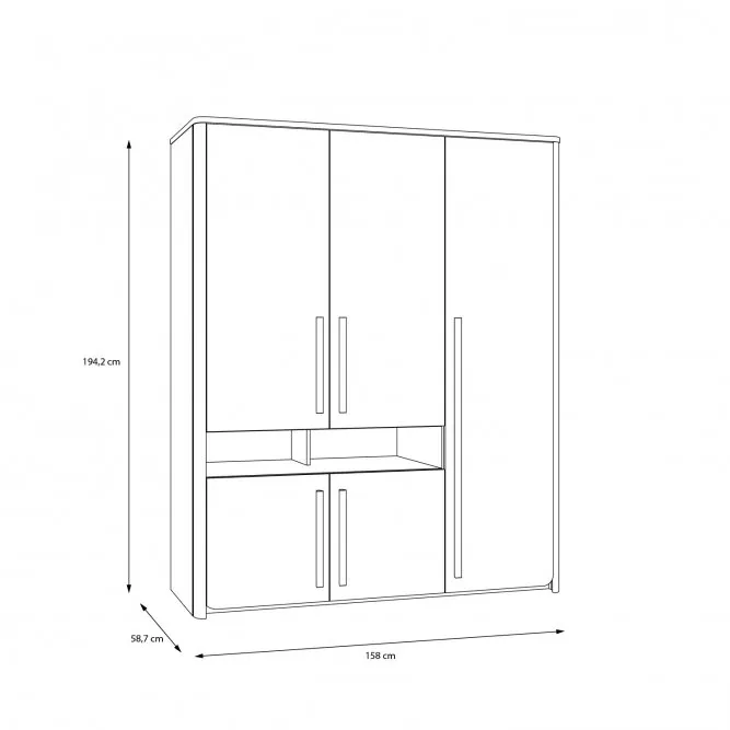 Niezwykle pojemna i praktyczna szafa do pokoju młodzieżowego. Przestronne i przemyślane wnętrze zapewni ogromną ilość miejsca na ubrania, bieliznę, a także inne niezbędniki nastolatka. Szafa posiada szeroki drążek na wieszaki, umieszczony za dwoma frontami po lewej stronie. Pod nim znajduje się otwarta półka oraz zamykana szafka. Dodatkowo po prawej stronie znajduje się słupek z półkami. Mnóstwo półek pozwoli uporządkować garderobę i pomoże utrzymać porządek we wnętrzu bez potrzeby posiadania dużej ilości mebli.