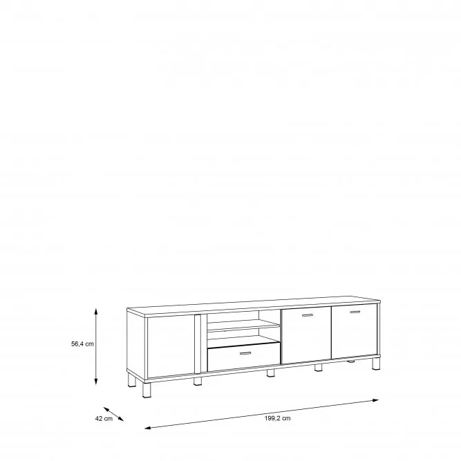 Szafka RTV jest niezbędnym elementem wyposażenia pokoju dziennego. Ta wykonana w subtelnym zestawieniu dekoru Świerk Alpejski wraz z dekorem Czarnym nada każdemu wnętrzu nowoczesnego wyglądu.