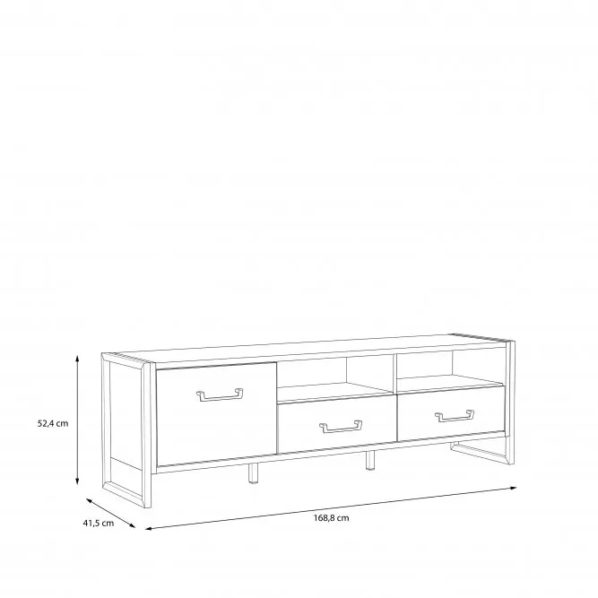 Szafka RTV z kolekcji HUD to idealny przedstawiciel mebli w stylu industrialnym. Połączenie kolorystyczne dębu klepkowego z ciemnoszarym eleganckim betonem dodatkowo podkreśla i nadaje wyjątkowego klimatu loftowego. Wysoka jakość wykonania z pewnością pozwoli cieszyć oko przez długi czas. Szafka została wyposażona w dwie otwarte półki, dwie szuflady oraz jedną zamykaną szafkę.