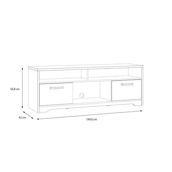 Szafka RTV z kolekcji JOADAKIS posiada 2 szafki i 3 otwarte wnęki, które pomogą w przechowywaniu sprzętu RTV. Na blacie możesz ustawić telewizor o wielkości do 65 cali, natomiast otwór w tylnej ścianie szafki umożliwia łatwą organizację kabli.