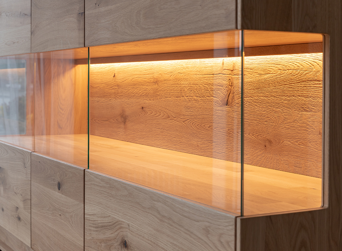 · Wbudowane oświetlenie LED – podświetlenie tylnej części wnętrza witryny podkreśla eksponowane przedmioty, tworząc przytulną atmosferę w pomieszczeniu;