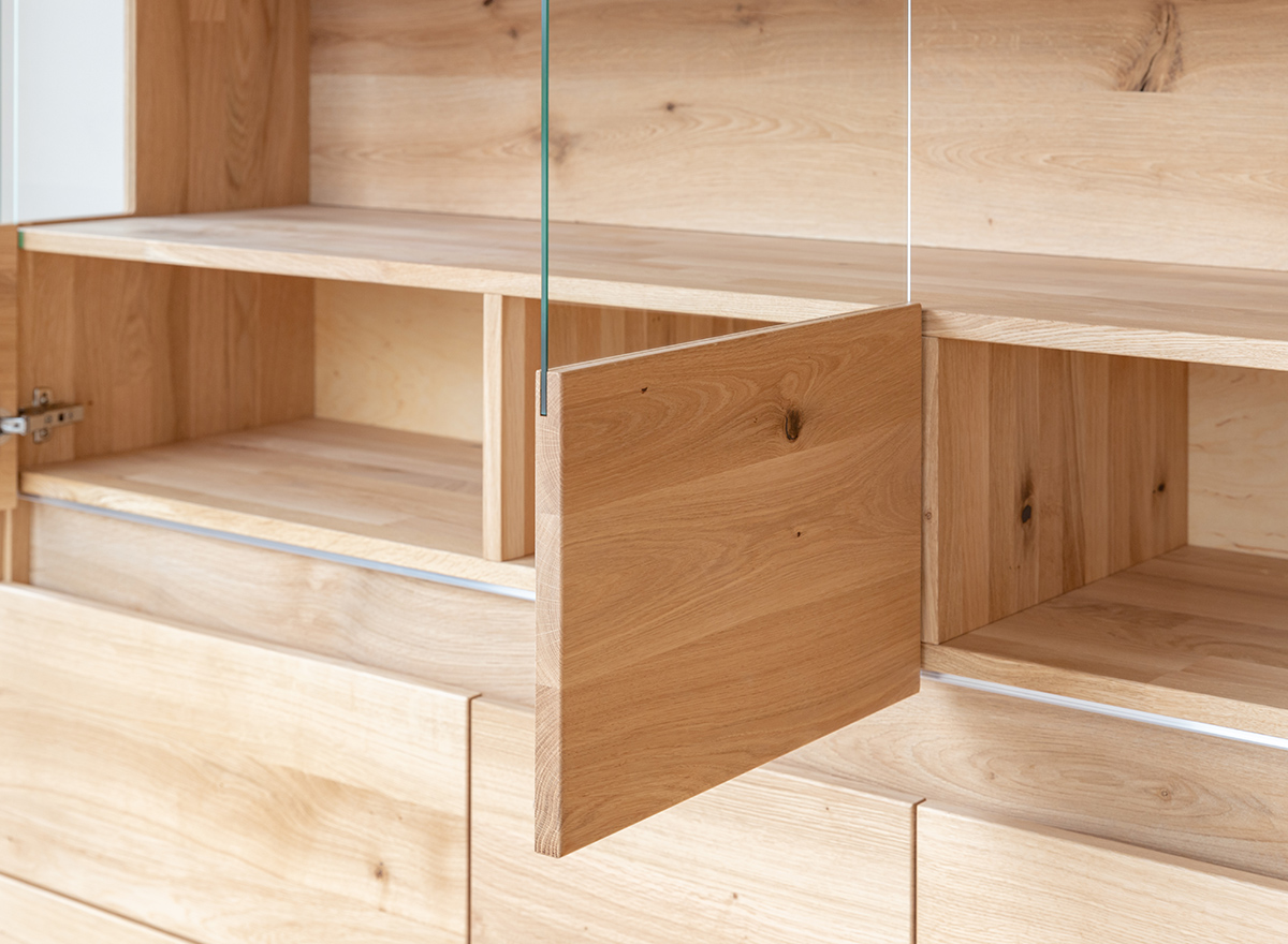 Nowoczesna 6-drzwiowa witryna została w całości wykonana z litego drewna dębowego, starannie wyselekcjonowanego i poddanego procesowi olejowania, który podkreśla naturalną strukturę słojów i chroni powierzchnię przed codziennym użytkowaniem. Witryna wyposażona jest liczne pary drzwi z systemem cichego domyku, a wnętrze zostało podzielone na praktyczne półki, umożliwiające wygodne rozmieszczenie przedmiotów różnej wielkości. Całość wieńczy dołączone do zestawu energooszczędne oświetlenie LED, idealne, aby podkreśli wyeksponowane elementy w przeszklonej, górnej części witryny.