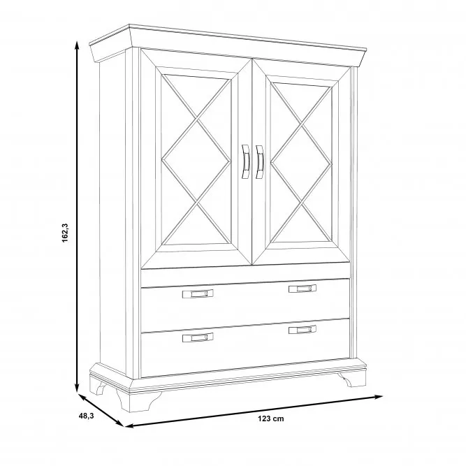 Ciepły kolor pinii białej, charakterystyczne fronty, metalowe uchwyty w kolorze starego srebra, stylizowane cokoły i nóżki oraz szprosy to cechy wyróżniające kolekcję. Mebel składa się z dwóch pojemnych szuflad oraz półek wykonanych ze szkła hartowanego. Za dodatkową opłatą możemy zakupić oświetlenie (klasa energetyczna < 30lm), dzięki czemu półki zostaną szczególnie wyeksponowane. W połączeniu z pozostałymi bryłami kolekcji witryna świetnie sprawdzi się w salonie i jadalni tworząc ciekawą aranżację wnętrza w stylu prowansalskim.