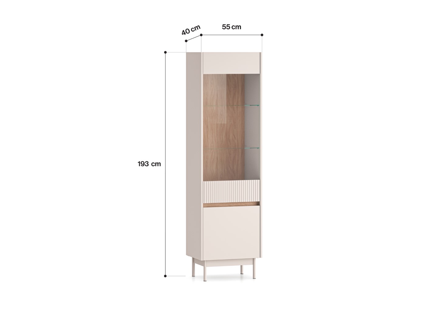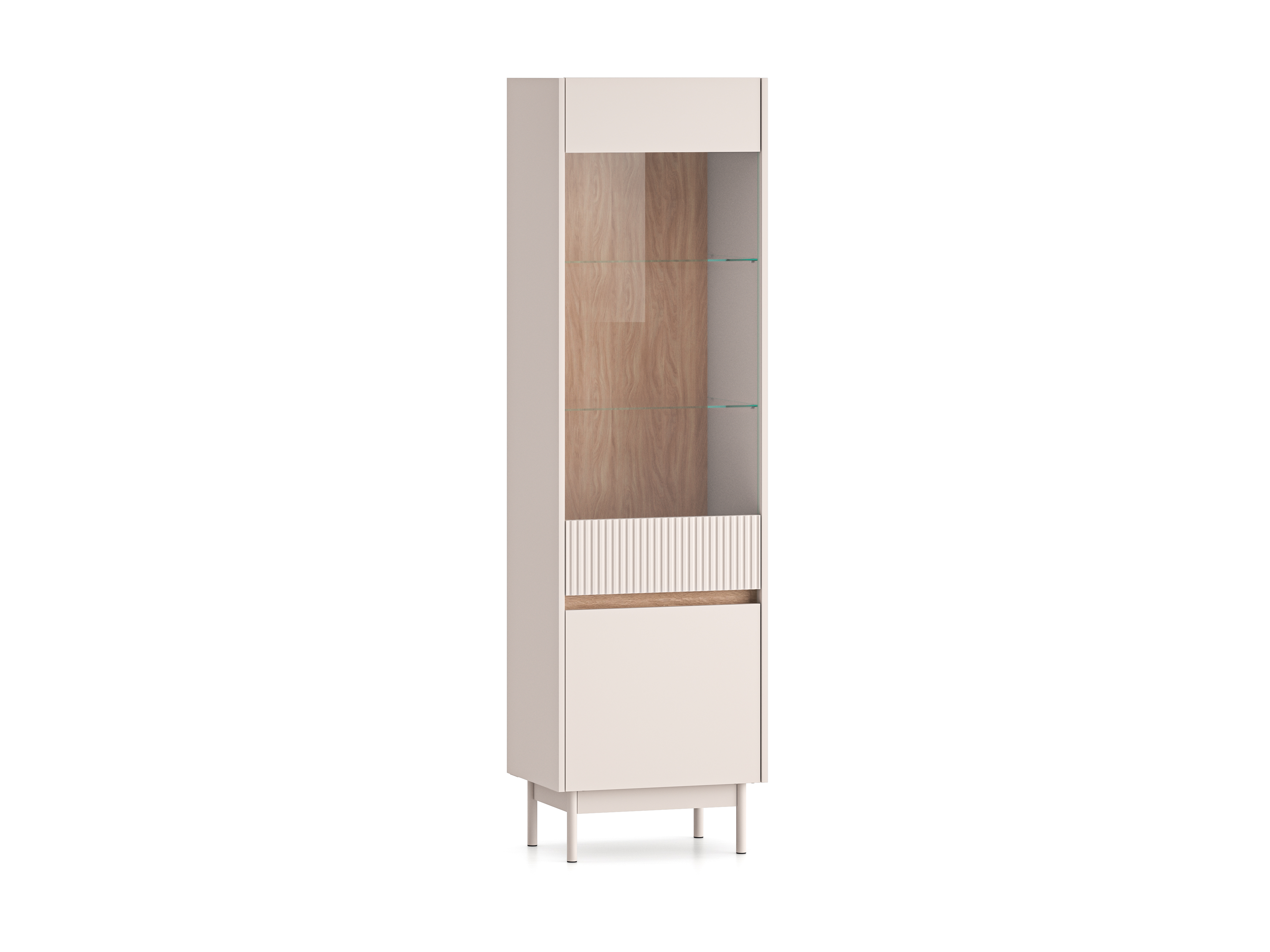 Kaszmirowa witryna szklana dzięki swojej jasnej kolorystyce wprowadzi ciepło, spokój i harmonię do wystroju wnętrza. Oryginalna wstawka z drewnianym dekorem w odcieniu dąb cremona, której dopełnia popularny w ostatnim czasie motyw ryflowania, to przepis na aranżację pełną przytulności elegancji i dobrego smaku. Wąska beżowa witrynaryflowana ze względu na swoją funkcję i sposób przeznaczenia, będzie idealnym dopełnieniem aranżacji salonu, jadalni, gabinetu biurowego i domowej biblioteczki. Z jej pomocą nie tylko zorganizujesz przestrzeń, ale też wyeksponujesz najpiękniejsze ozdoby i dekoracje.